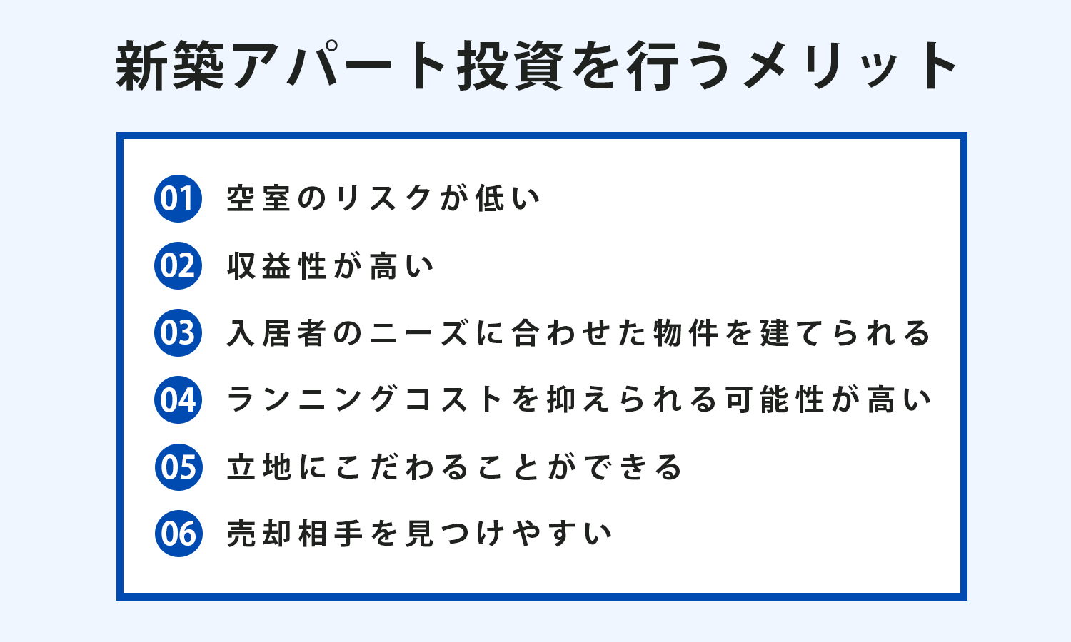 主なメリットとして、空室リスクが低い、収益性が高い、売却先を見つけやすいなどがあげられます。